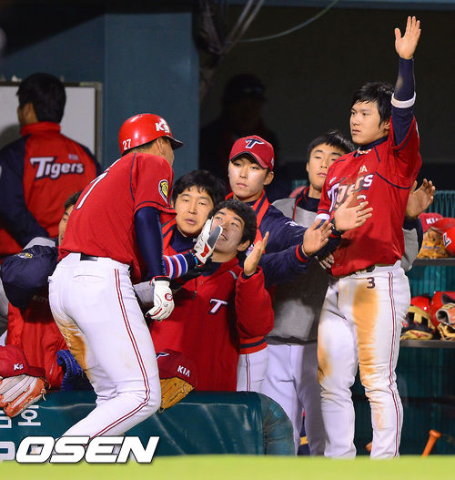 1일 오후 서울 잠실구장에서 열린 '2013 한국야쿠르트 세븐 프로야구' 두산 베어스와 KIA 타이거즈의 경기, 5회초 2사 3루 KIA 차일목의 1타점 적시타때 3루 주자 김상현이 동료들의 축하를 받고 있다