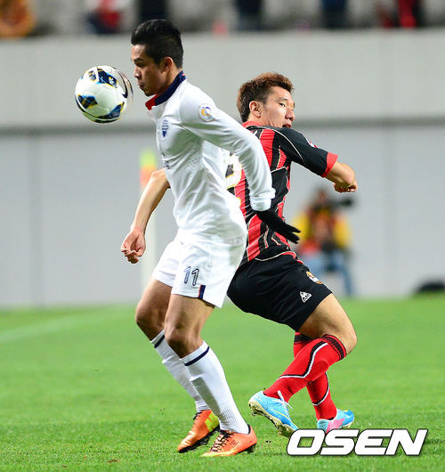 1일 오후 서울월드컵경기장에서 열린 2013 아시아축구연맹(AFC) 챔피언스리그 조별예선 E조 6차전 FC 서울과 부리람 유나이티드(태국)의 경기, 전반 서울 최효진이 부리람 선수에게 에카차이에게 공을 뺏기고 있다.