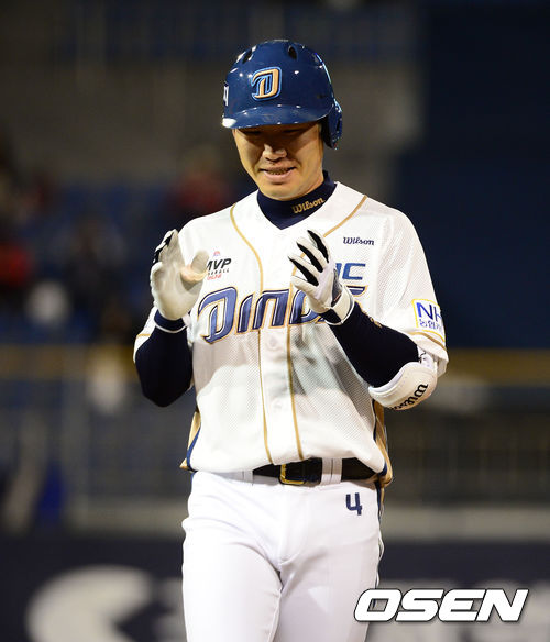 1일 오후 창원 마산구장에서 열린 '2013 한국야쿠트르 세븐 프로야구' NC 다이노스와 LG 트윈스의 경기, 4회말 1사 1,3루에서 NC 지석훈이 1타점 좌전 적시타를 날리고 기뻐하고 있다.