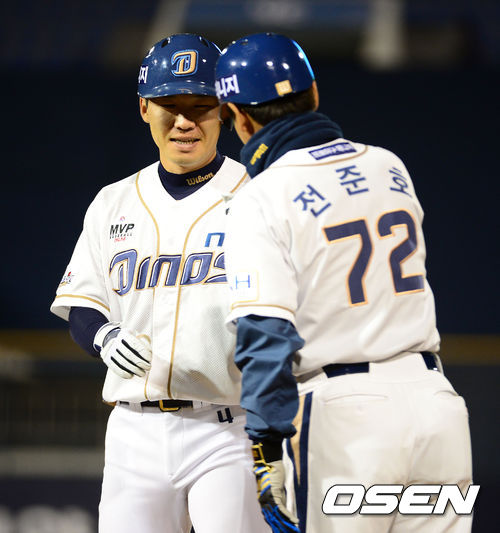 1일 오후 창원 마산구장에서 열린 '2013 한국야쿠트르 세븐 프로야구' NC 다이노스와 LG 트윈스의 경기, 4회말 1사 1,3루에서 NC 지석훈이 1타점 좌전 적시타를 날리고 전준호 코치와 기뻐하고 있다.