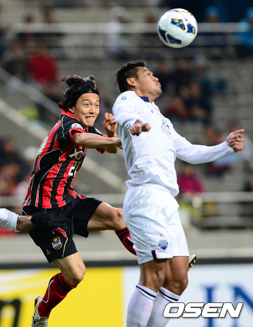 1일 오후 서울월드컵경기장에서 열린 2013 아시아축구연맹(AFC) 챔피언스리그 조별예선 E조 6차전 FC 서울과 부리람 유나이티드(태국)의 경기, 후반 서울 고광민이 부리람 수비와 공중볼 다툼을 하고 있다.