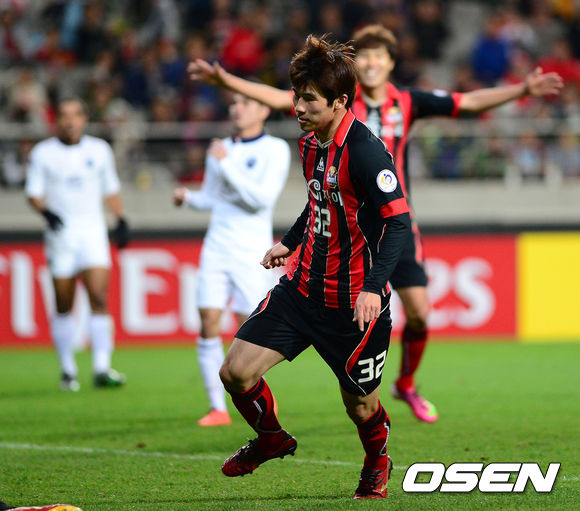 1일 오후 서울월드컵경기장에서 열린 2013 아시아축구연맹(AFC) 챔피언스리그 조별예선 E조 6차전 FC 서울과 부리람 유나이티드(태국)의 경기, 후반 서울 정승용이 선제골을 성공 시키고 환호하고 있다.