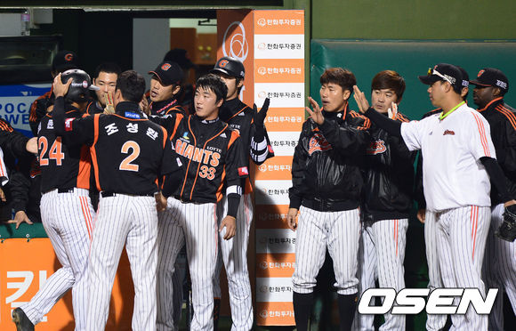1일 오후 대전구장에서 열린 '2013 한국야쿠르트 세븐 프로야구' 한화 이글스와 롯데 자이언츠경기, 6회초 2사 2루 황재균의 적시타때 2루주자 김문호 역전 득점을 올리며 동료들의 환영을 받고 있다.