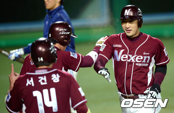 1일 오후 대구구장에서 열린 '2013 한국야쿠르트 세븐 프로야구' 삼성 라이온즈와 넥센 히어로즈의 경기 7회초 2사 2,3루 넥센 이택근이 3점 홈런을 때리고 동료들과 기뻐하고 있다.