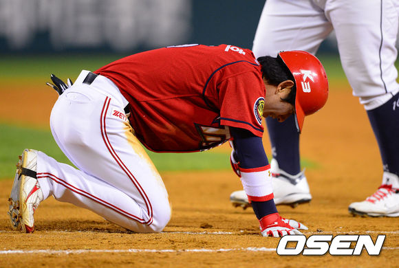 1일 오후 서울 잠실구장에서 열린 '2013 한국야쿠르트 세븐 프로야구' 두산 베어스와 KIA 타이거즈의 경기, 7회초 2사 1,3루 KIA 홍재호가 내야땅볼을 날리고 슬라이딩을 했다. 하지만 베이스 근처에 가지도 못하고 아웃되자 허탈해하고 있다.