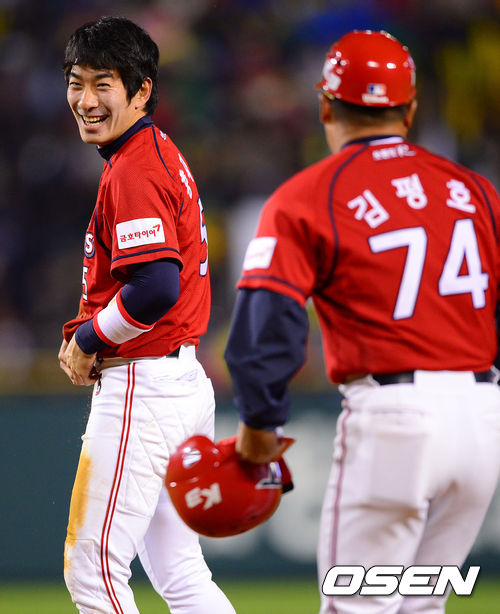 1일 오후 서울 잠실구장에서 열린 '2013 한국야쿠르트 세븐 프로야구' 두산 베어스와 KIA 타이거즈의 경기, 7회초 2사 1,3루 KIA 홍재호가 내야땅볼을 날리고 슬라이딩을 했다. 하지만 베이스 근처에 가지도 못하고 아웃되자 어이없어 미소 짓고 있다
