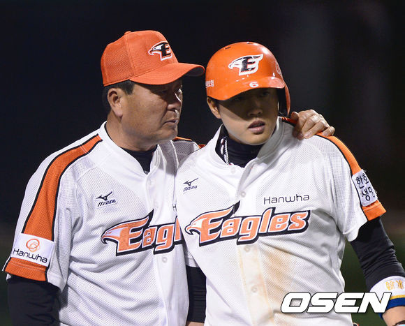 1일 오후 대전구장에서 열린 '2013 한국야쿠르트 세븐 프로야구' 한화 이글스와 롯데 자이언츠경기, 7회말 무사 1,2루 김성한 코치가 오선진 타자에게 작전지시를 내리고 있다.