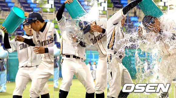 경기후 NC 김태군의 히어로 인터뷰에 권희동이 물을 뿌리고 있다./jpnews@osen.co.kr