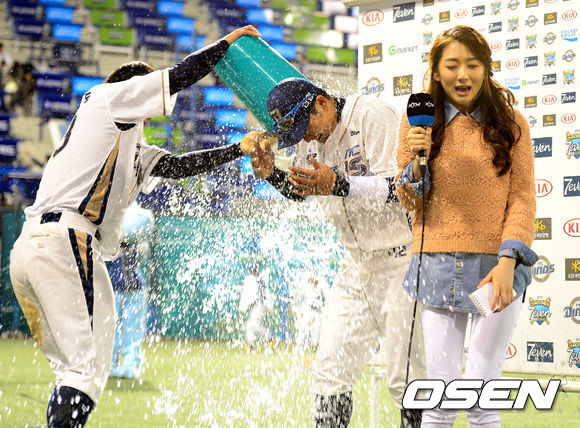 경기후 NC 김태군의 히어로 인터뷰에 권희동이 물을 뿌리자 XTM 조유영 아나운서가 깜짝 놀라고 있다. 지난 30일 경기에서는 이호준의 인터뷰에 김태군이 케이크를 묻히고 도망갔었다. /jpnews@osen.co.kr