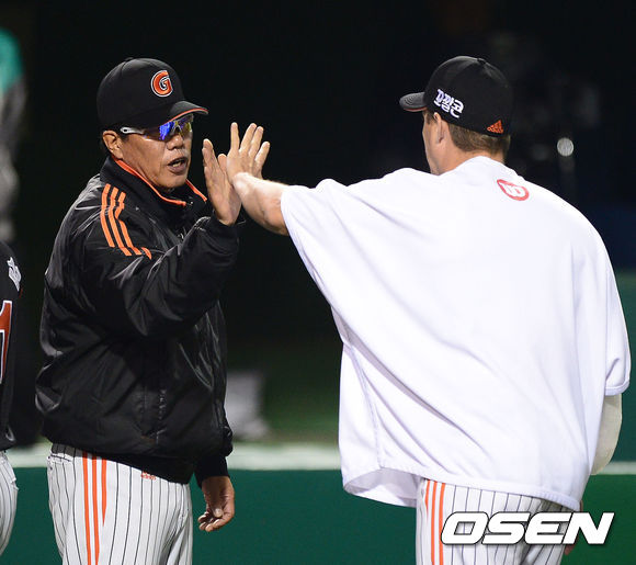 경기 종료후 선발승리한 옥스프링이 김시진감독의 축하를 받고 있다./ ajyoung@osen.co.kr