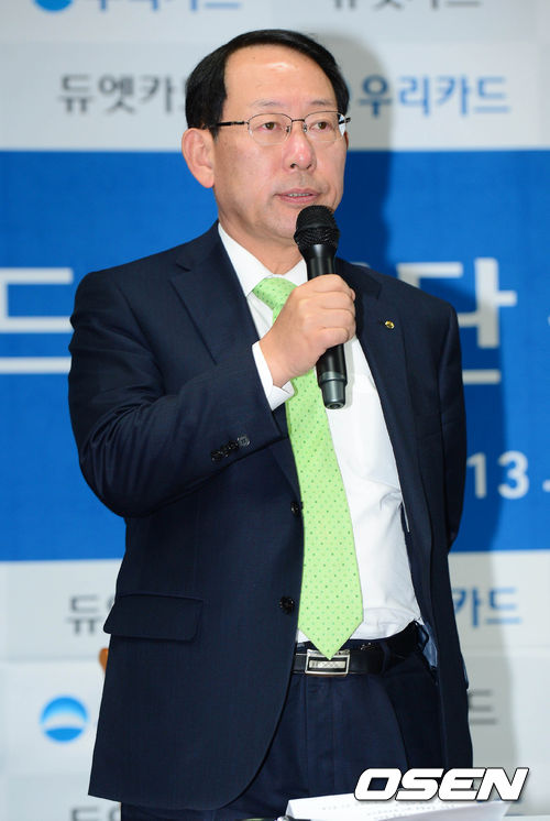 2일 오전 서울 종로구 중학동 우리카드 본사에서 열린 우리카드 프로배구단 신임감독 취임식에서 정현진 구단주가 인사말을 하고 있다.