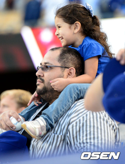 2일(이하 한국시간) 미국 캘리포니아 로스앤젤레스 다저스타디움에서 LA 다저스와 콜로라도 록키츠의 경기가 열렸다. 경기 시작 전 꼬마 야구팬이 아빠의 무등에 올라 즐거워하고 있다.