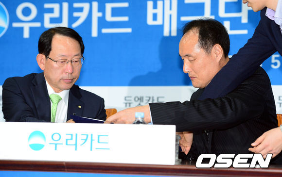 2일 오전 서울 종로구 중학동 우리카드 본사에서 열린 우리카드 프로배구단 신임감독 취임식에서 강만수 감독(오른쪽)이 정현진 구단주와 계약서를 교환하고 있다.