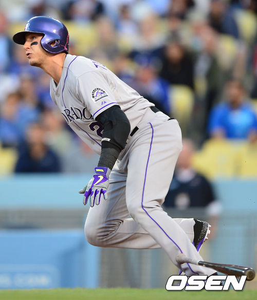 2일(이하 한국시간) 미국 캘리포니아 로스앤젤레스 다저스타디움에서 LA 다저스와 콜로라도 로키스의 경기가 열렸다. 1회초 콜로라도 공격 무사 만루 상황 4번 트로이 툴로위츠키가 2타점 좌중간 2루타를 날리고 타구를 바라보고 있다.