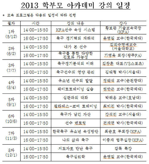 대한축구협회는 ‘2013 학부모 아카데미’를 오는 12일부터 12월까지 8차례에 걸쳐 진행한다.