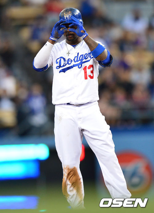 2일(이하 한국시간) 미국 캘리포니아 로스앤젤레스 다저스타디움에서 LA 다저스와 콜로라도 로키스의 경기가 열렸다. 1회말 다저스 공격 1사 주자없는 상황 2번 핸리 라미레스가 2루타를 날리고 더그아웃 동료들을 향해 세리머니를 하고 있다.