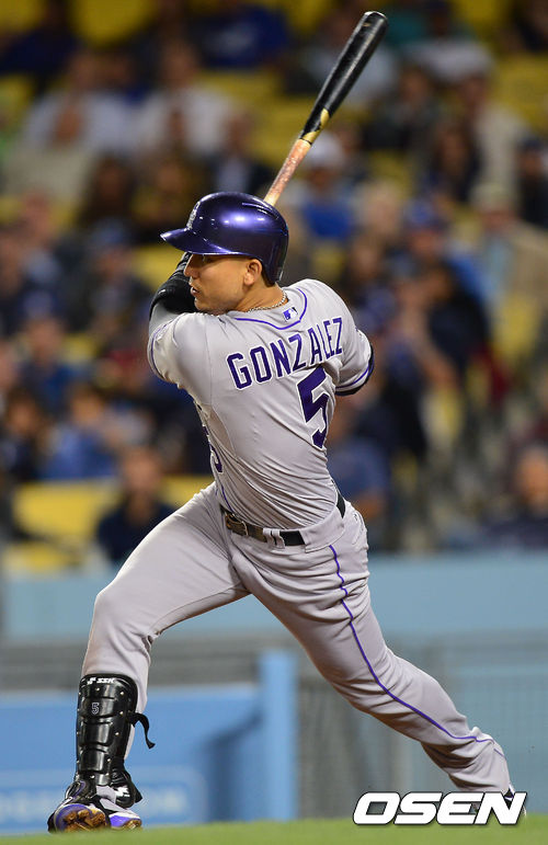 2일(이하 한국시간) 미국 캘리포니아 로스앤젤레스 다저스타디움에서 LA 다저스와 콜로라도 로키스의 경기가 열렸다. 4회초 콜로라도 공격 1사 1, 3루 상황 3번 알렉스 곤살레스가 우익선상 2루타를 날리고 있다.