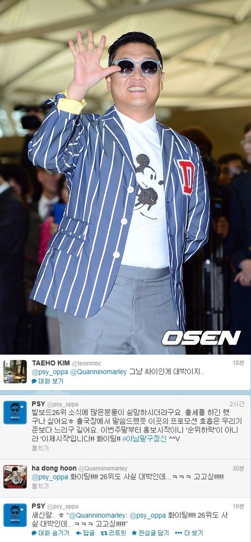 하하는 2일 싸이가 자신의 트위터에 "빌보드 26위 소식에 많은 분들이 실망하시더라고요. 출세를 하긴 했구나 싶어요. 출국장에서 말씀 드렸듯 이곳의 프로모션 호흡은 우리 기준보다 느리고 길어요. 이번 주말부터 홍보 시작이니 '순위하락'이 아니라 '이제시작'입니다. 파이팅!"이라고 올린 글에 "파이팅! 26위도 사실 대박인데.고고싱!"이라는 댓글을 달았다.