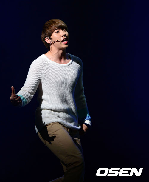 2일 오후 서울 능동 유니버설아트센터에서 열린 뮤지컬 '남자가 사랑할 때' 프레스콜에서 그룹 유키스 훈이 연기를 펼치고 있다.
