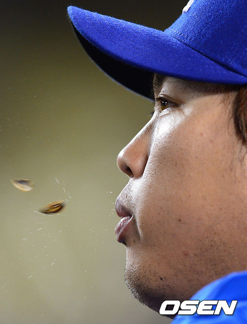 2일(이하 한국시간) 미국 캘리포니아 로스앤젤레스 다저스타디움에서 LA 다저스와 콜로라도 로키스의 경기가 열렸다. 더그아웃에 있는 류현진이 해바라기씨를 먹으며 경기를 지켜보고 있다.