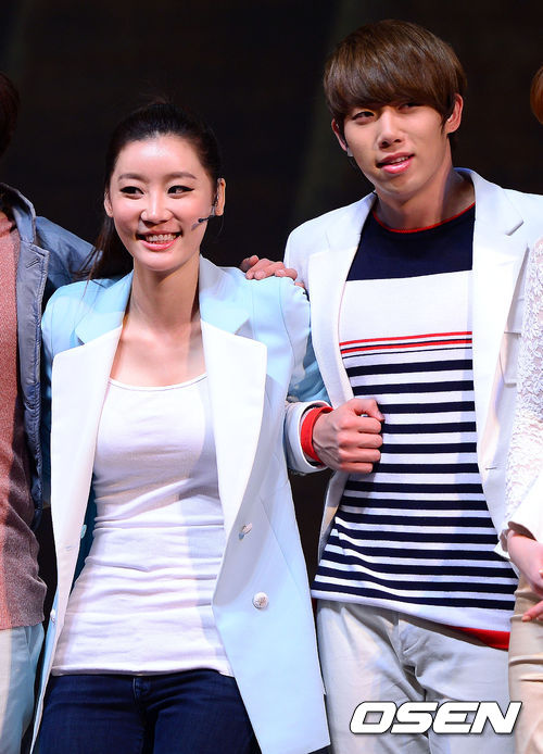 2일 오후 서울 능동 유니버설아트센터에서 열린 뮤지컬 '남자가 사랑할 때' 프레스콜에서 배우 한수연과 그룹 유키스 훈이 기념촬영을 하고 있다.