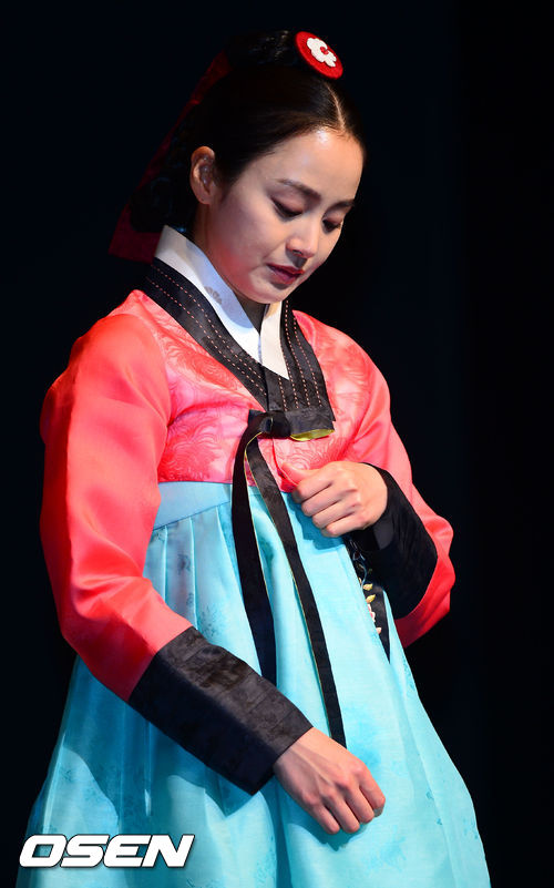 2일 오후 경기도 고양시 덕양구 고양 어울림누리 어울림극장에서 고양 지명 600돌을 맞아 ‘고양 600년 기념식’이 열렸다. 이 자리에서 김태희가 한복을 만지고 있다.