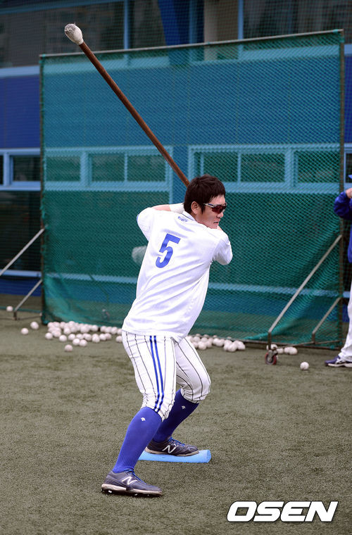 2일 오후 대구구장에서 열리는 '2013 한국야쿠르트 세븐 프로야구' 삼성 라이온즈와 넥센 히어로즈의 경기전 삼성 조동찬이 곤봉을 이용해 훈련을 하고 있다.