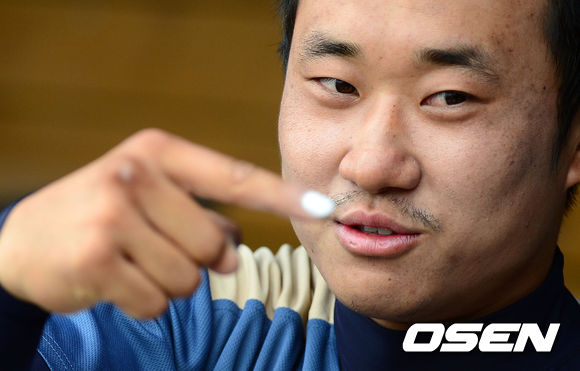 2일 오후 창원 마산구장에서 열리는 NC 다이노스와 LG 트윈스의 경기, 경기에 앞서 NC 김태군이 취재진과 이야기를 나누고 있다. 김태군은 지난 1일 LG 주키치를 상대로 데뷔 첫 홈런을 날렸다.