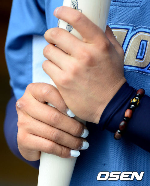 2일 오후 창원 마산구장에서 열리는 NC 다이노스와 LG 트윈스의 경기, 경기에 앞서 NC 김태군이 취재진과 이야기를 나누고 있다. '안방마님' 김태군의 손톱에 흰색 매니큐어가 칠해져 있다.