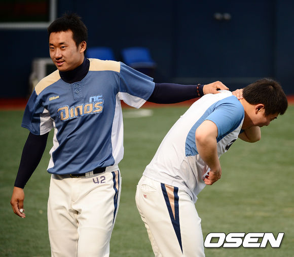 2일 오후 창원 마산구장에서 열리는 NC 다이노스와 LG 트윈스의 경기, 경기에 앞서 훈련을 마친 NC 김태군이 권희동과 장난을 치고 있다. 권희동은 지난 1일 김태군의 히어로 인터뷰에 물을 뿌리고 도망갔었다.