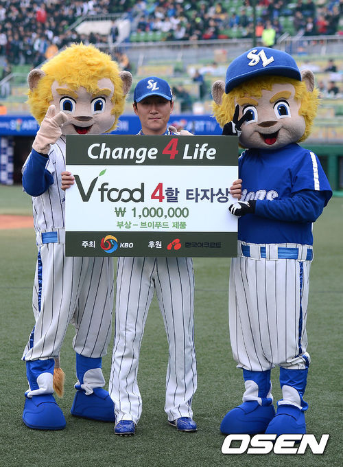 2일 오후 대구구장에서 열리는 '2013 한국야쿠르트 세븐 프로야구' 삼성 라이온즈와 넥센 히어로즈의 경기전 'V food 4할 타자상을 받은 삼성 배영섭이 포토타임을 갖고 있다.