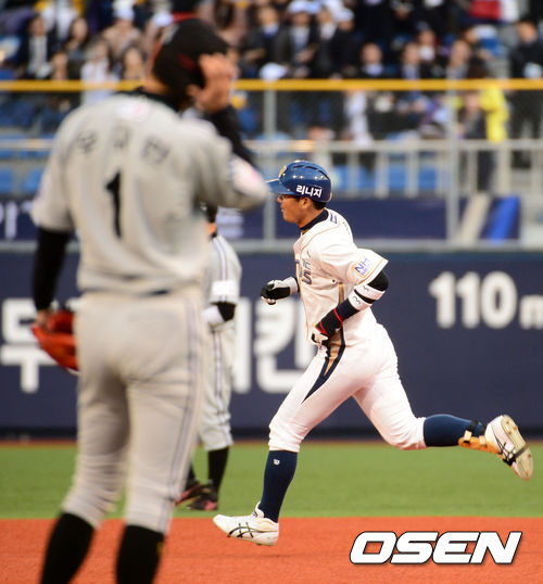 2일 오후 창원 마산구장에서 열린 NC 다이노스와 LG 트윈스의 경기, 1회말 2사에서 NC 박정준이 선제 솔로포를 날리고 그라운드를 돌고 있다.