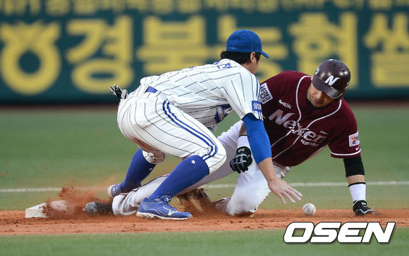 2일 오후 대구구장에서 열린 '2013 한국야쿠르트 세븐 프로야구' 삼성 라이온즈와 넥센 히어로즈의 경기 1회초 2사 1루 넥센 이택근이 2루 도루를 성공하고 있다.
