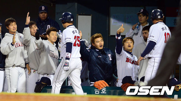 2일 오후 서울 잠실구장에서 열린 '2013 한국야쿠르트 세븐 프로야구' 두산 베어스와 KIA 타이거즈의 경기 2회말 2사 만루 박건우의 2타점 적시타에 홈을 밟은 양의지, 최준석이 덕아웃에서 동료들과 하이파이브를 하고 있다.