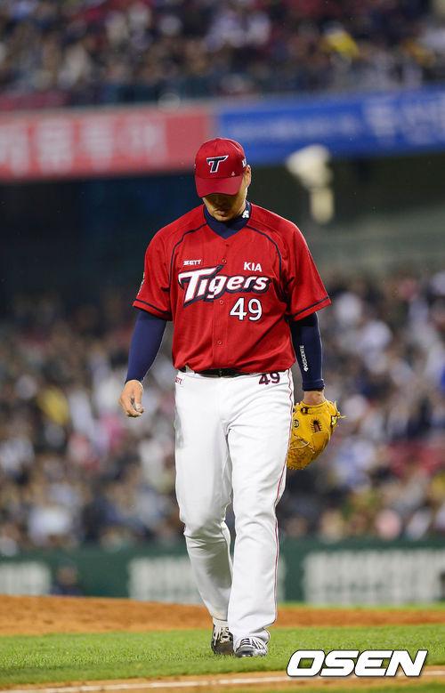 2일 오후 서울 잠실구장에서 열린 '2013 한국야쿠르트 세븐 프로야구' 두산 베어스와 KIA 타이거즈의 경기 2회말 2실점을 허용한 김진우가 고개를 숙인 채 덕아웃으로 향하고 있다.