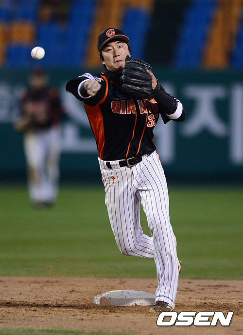 2일 오후 대전구장에서 열린 '2013 한국야쿠르트 세븐 프로야구' 한화 이글스와 롯데 자이언츠경기,3회말 1사 1루 이학준의 내야땅볼때 롯데 정훈 2루수가 2루를 포스아웃시키며 1루에 송구하였으나 타자주자는 세이프 되었다.