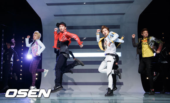 2일 오후 서울 상암동 CJ E&M에서 진행된 Mnet '엠카운트다운'(이하 엠카) 사전 녹화 무대에서 샤이니가 열창을 하며 화려한 안무를 선보이고 있다.