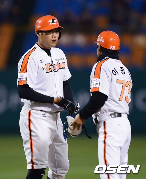 2일 오후 대전구장에서 열린 '2013 한국야쿠르트 세븐 프로야구' 한화 이글스와 롯데 자이언츠경기,3회말 2사 1루 최진행 1타점 적시타를 날리고 2루에진루 이종범코치의 환영을 받고 있다.