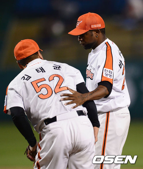 2일 오후 대전구장에서 열린 '2013 한국야쿠르트 세븐 프로야구' 한화 이글스와 롯데 자이언츠경기,4회초 1사 한화선발 바티스타가 전준우의 안타성 좋은수비로 아웃처리시킨 김태균에세 감사표시를 하고 있다.