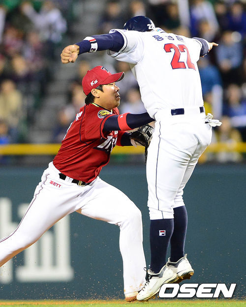 2일 오후 서울 잠실구장에서 열린 '2013 한국야쿠르트 세븐 프로야구' 두산 베어스와 KIA 타이거즈의 경기 3회말 무사 1,2루 오재원의 병살타를 잡은 안치홍이 2루로 달리던 홍성흔을 태그아웃 시키고 있다.