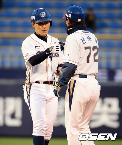 2일 오후 창원 마산구장에서 열린 NC 다이노스와 LG 트윈스의 경기, 2회말 1사 1루에서 NC 지석훈이 1타점 적시 2루타를 날리고 전준호 코치와 주먹을 맞대고 있다.