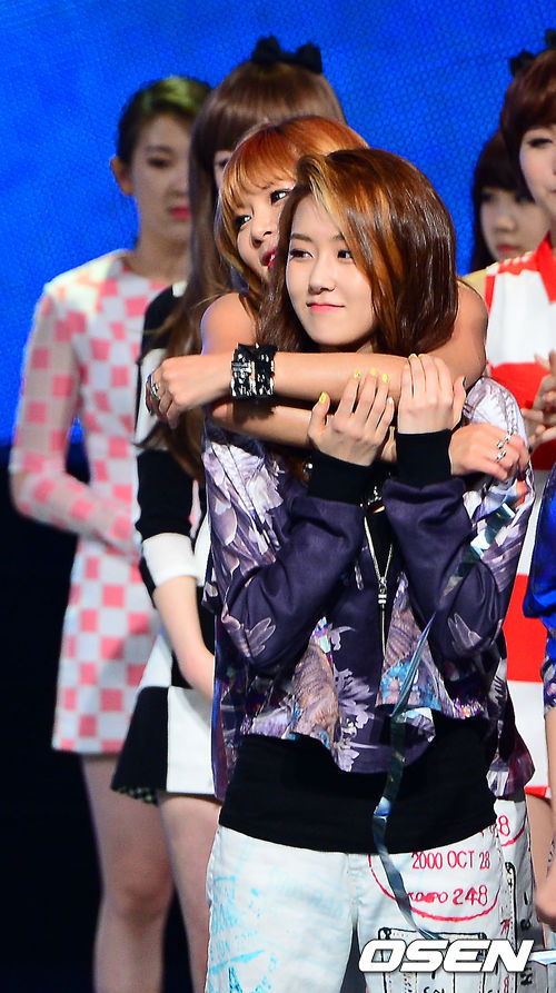 2일 오후 서울 상암동 CJ E&M에서 진행된 Mnet '엠카운트다운'(이하 엠카) 생방송에서 싸이의 '젠틀맨'이 1위가 되자 포미닛의 현아가 허가윤을 껴안으며 기뻐하고 있다.