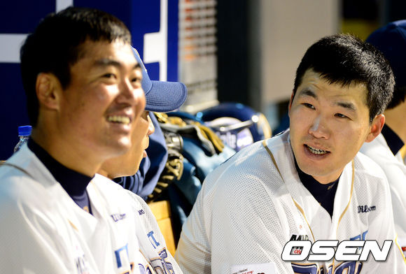 2일 오후 창원 마산구장에서 열린 NC 다이노스와 LG 트윈스의 경기, 클리닝타임에 솔로포르 날린 NC 박정준과 1타점 적시타를 날린 지석훈이 이야기를 나누며 즐거워하고 있다.