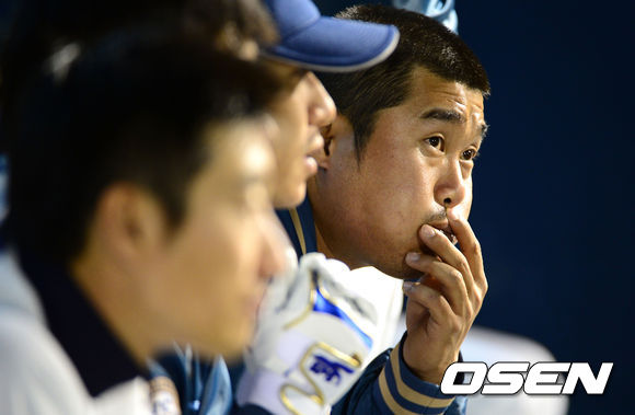2일 오후 창원 마산구장에서 열린 NC 다이노스와 LG 트윈스의 경기, 5회말 NC 이호준이 더그아웃에서 경기를 지켜보고 있다.
