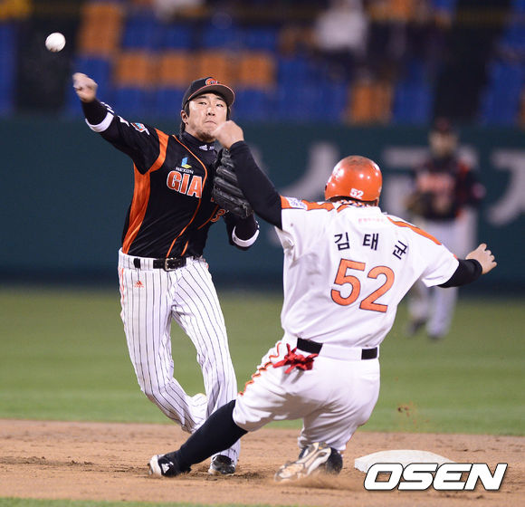 2일 오후 대전구장에서 열린 '2013 한국야쿠르트 세븐 프로야구' 한화 이글스와 롯데 자이언츠경기,6회말 무사 1루 이대수 내야땅볼때 1루 주자 김태균 2루에서 포스아웃처리되고 있다.