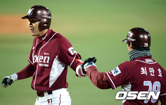 2일 오후 대구구장에서 열린 '2013 한국야쿠르트 세븐 프로야구' 삼성 라이온즈와 넥센 히어로즈의 경기 7회초 1사 2루 넥센 유한준이 1타점 적시타를 때리고 1루 최만호 코치와 기뻐하고 있다.