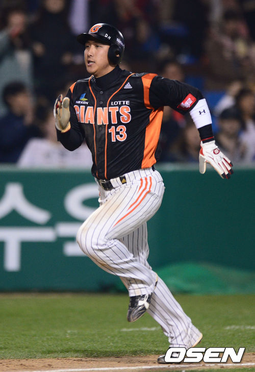 2일 오후 대전구장에서 열린 '2013 한국야쿠르트 세븐 프로야구' 한화 이글스와 롯데 자이언츠경기,7회초 1사 만루 강민호의 희생플라이때 3루주자 황재균 태그업 득점을 올리고 있다.