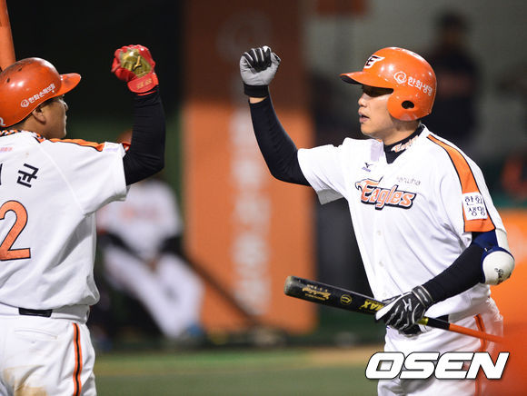 2일 오후 대전구장에서 열린 '2013 한국야쿠르트 세븐 프로야구' 한화 이글스와 롯데 자이언츠경기,7회말 2사 최진행 솔로홈런을 날리고 홈인 김태균의 환영을 받고 있다,