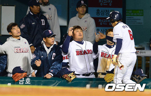 2일 오후 서울 잠실구장에서 열린 '2013 한국야쿠르트 세븐 프로야구' 두산 베어스와 KIA 타이거즈의 경기 6회말 1사 2,3루 임재철의 1타점 적시타에 홈을 밟은 3루주자 허경민이 덕아웃에서 동료들과 하이파이브를 하고 있다.