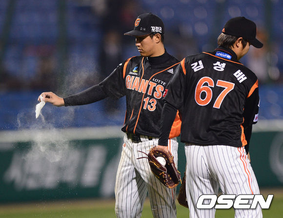 2일 오후 대전구장에서 열린 '2013 한국야쿠르트 세븐 프로야구' 한화 이글스와 롯데 자이언츠경기,8회말 2사 2루 정범모 타석때 롯데 황재균 3루수가 김성배 투수에게 로진을 전해주고 있다.